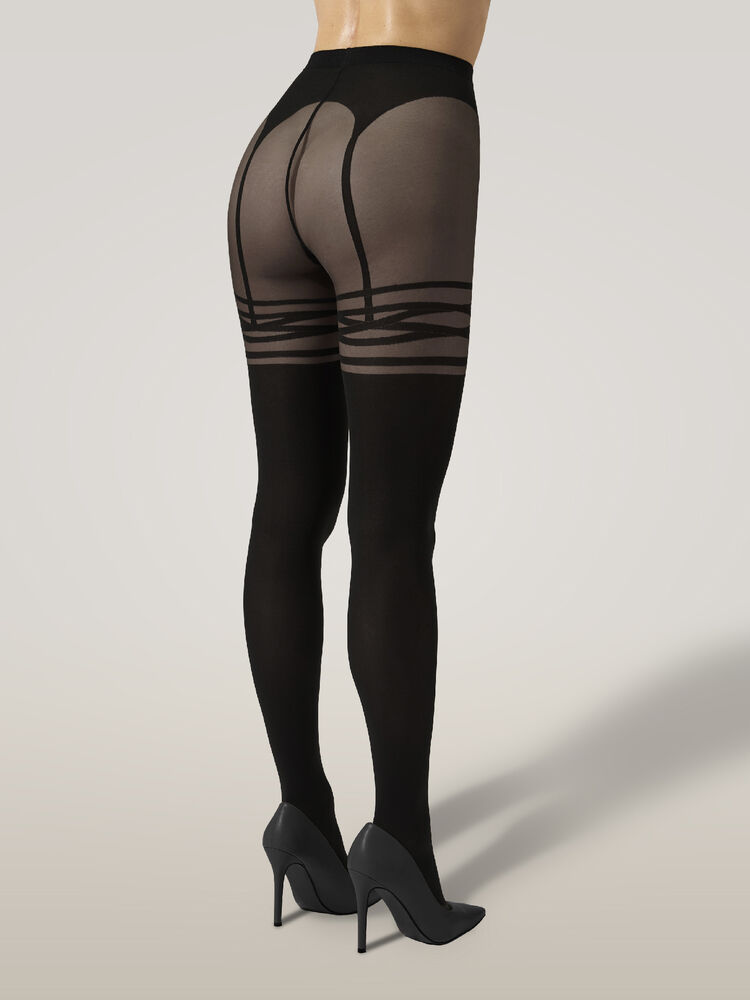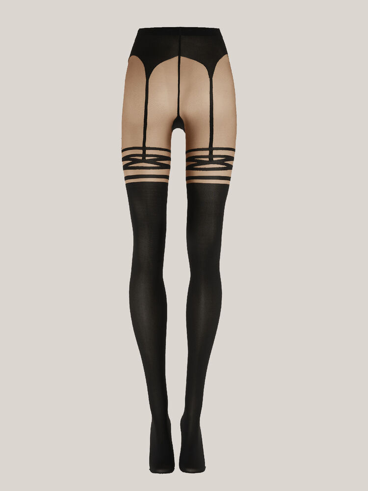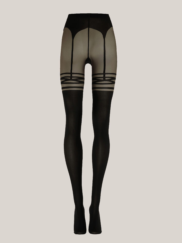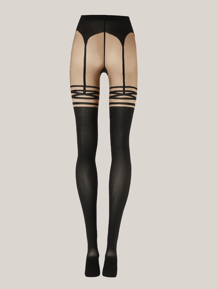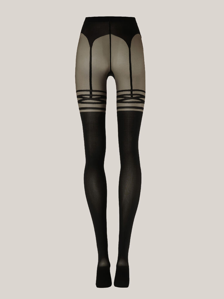 Dress to seduce with these ultra-feminine tights – designed to create the illusion of stockings paired with a garter belt. The unique motif expertly enhances your curves, while the irresistible texture mixing sheer and opaque effects takes the look to the next level. They're crafted using the circular knitting technique, sustainably dyed, and treated for a velvety matt finish. The soft, knitted waistband ensures a perfect fit.